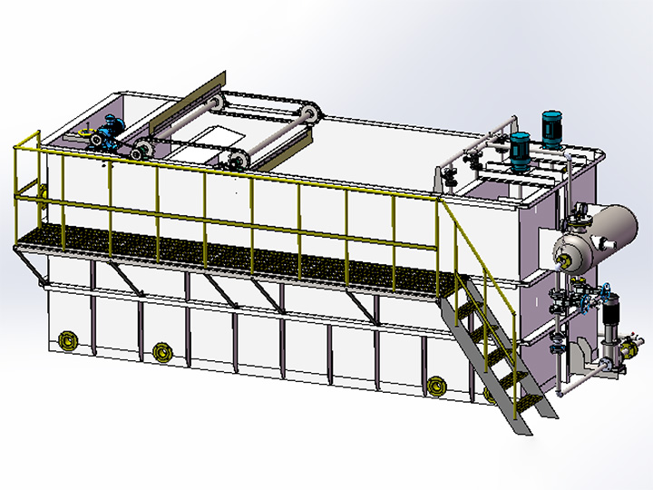 該裝置主要起固液分離作用,去除廢水中的懸浮物(SS)、油污、色度,同時(shí)可以降低COD、BOD等污染物,主要利用溶氣系統(tǒng)產(chǎn)生的溶氣水中的微氣泡,與水中的懸浮物絮體碰撞粘合在一起,形成“微小氣泡—懸浮物復(fù)合體”,該“微氣泡—懸浮物復(fù)合體”逐漸共聚,體積變大,形成比重小于1的“氣泡—懸浮物復(fù)合體”。溶氣水在 0.3-0.5MPa的工作壓力的情況下,使空氣Max限度地溶入水中,通過(guò)減壓釋放,形成直徑在20μm-30μm左右的微小氣泡。
